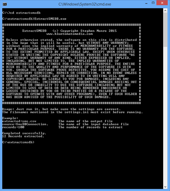Mobile Partner seems to have limits on the amount of records in stores in it's database, of a few months to just over 700 SMS records. This is only hearsay and has only been noted from observation. ExtractSMSDB ignores the folders that SMSs are stored in the Mobile Partner database, and just extracts the first X amount of text messages that are specified, sorted by the most recently added SMSs shown first.